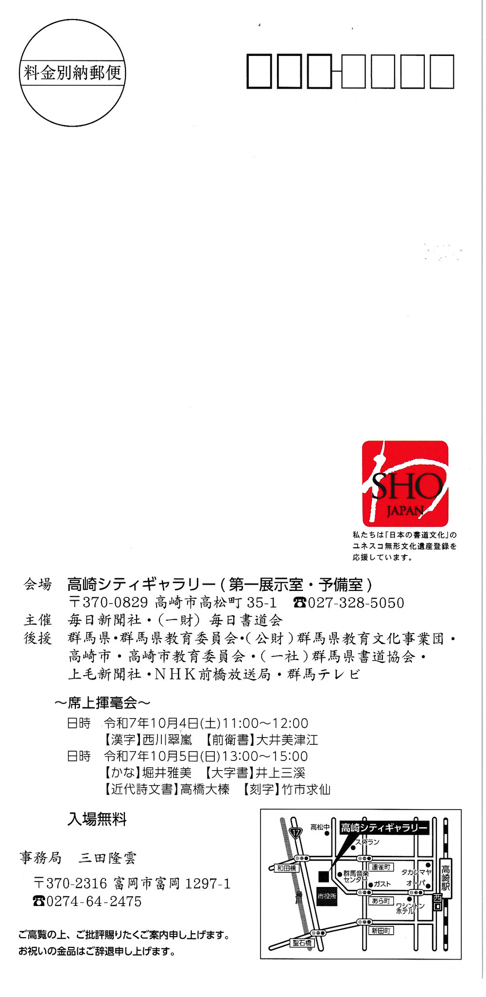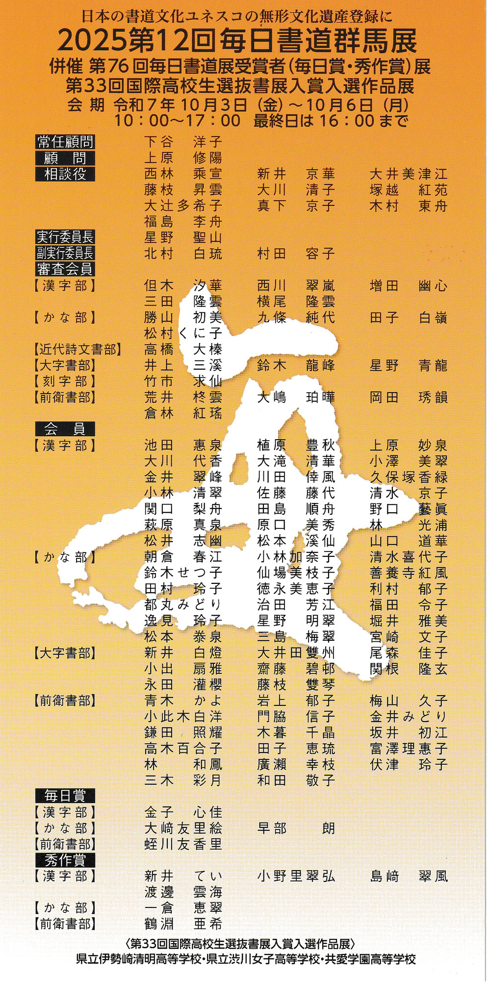 群馬県在住の毎日書道展審査会員と会員の方々および令和7年度入賞者による書道展です。皆様のご来場を心よりお待ちしております。詳細は、添付の画像をご参照ください。