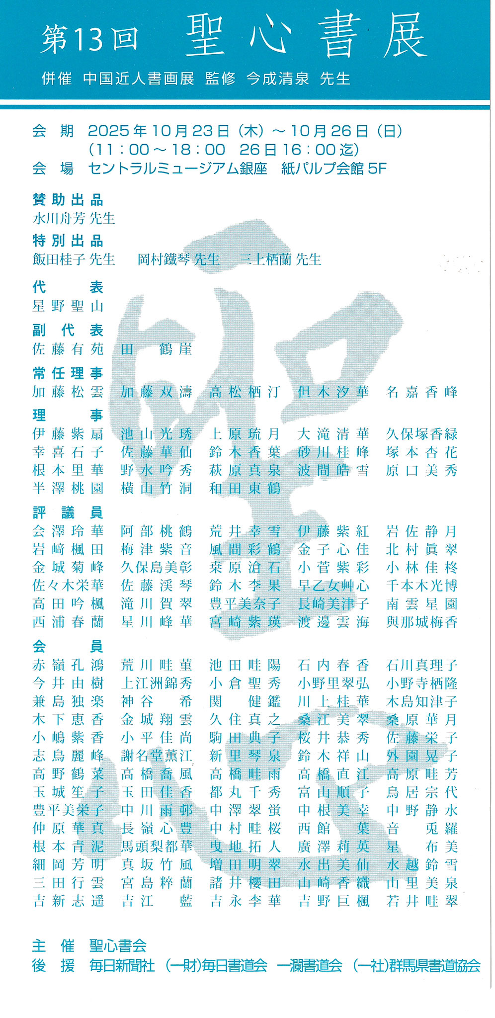 主幹をはじめとする、23名の聖筆会会員が出品いたしておりますので、皆様のご来場を心よりお待ちしております。詳細は、添付の画像をご参照ください。