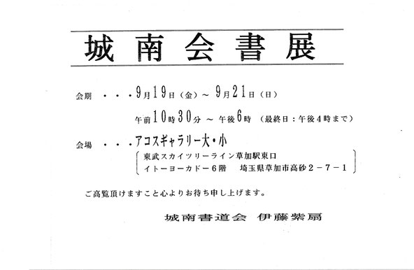 本会常任理事 伊藤紫扇 先生の社中展です。皆様のご来場を心よりお待ちしております。詳細は、添付の画像をご参照ください。